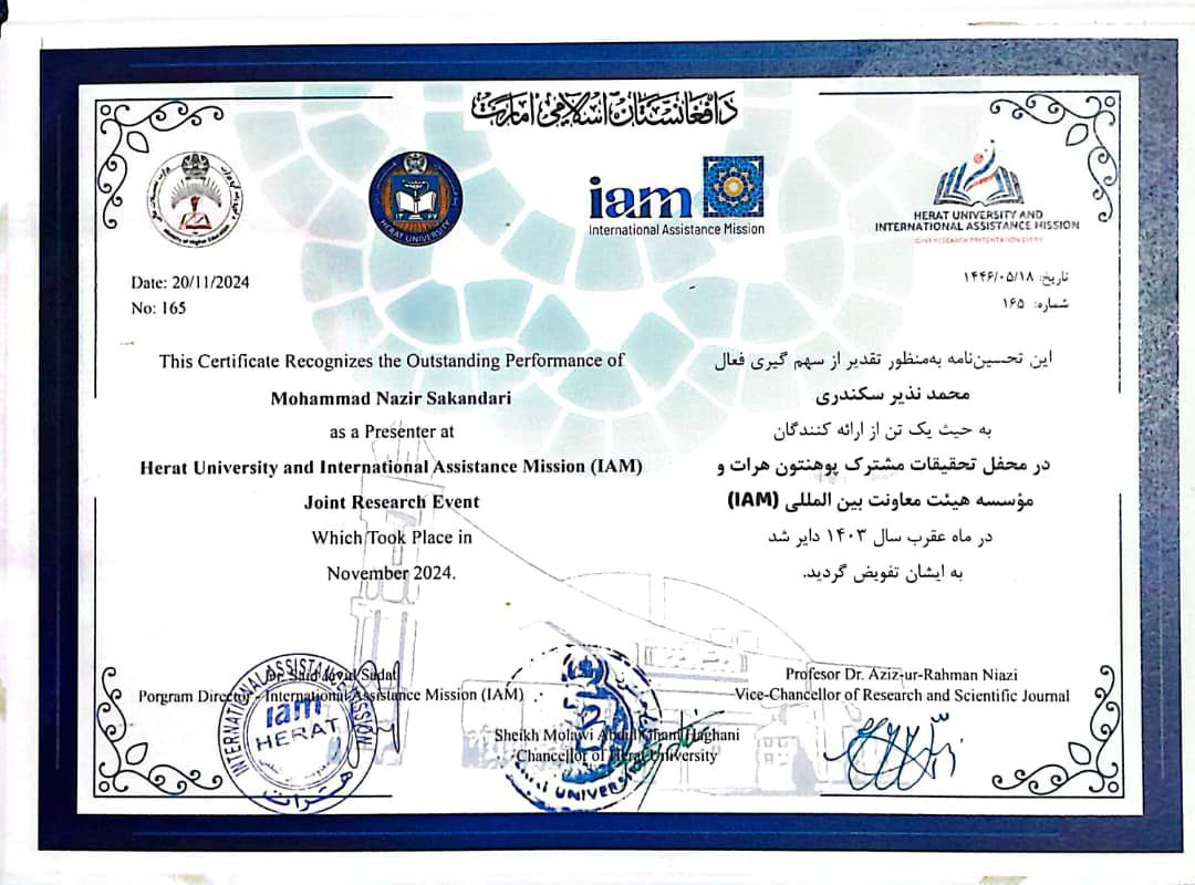 در این محفل به پاس همکاری¬های سازنده وارزندۀ دوجانبۀ پوهنتون هرات و نهادهای تحصیلی-صحی عاطفی، از طرف آن پوهنتون و مؤسسۀ IAM، تحسین¬نامه یی به منظور تقدیر از سهم¬ فعال ریاست انستیتوت در بخش برنامه¬های علمی-تدریسی و در عین حال کسب تجارب هر دو نهاد تحصیلی-صحی عاطفی از پوهنتون هرات، توسط معاون علمی-تحقیقی پوهنتون به رئیس انستیتوت تقدیم شد.
